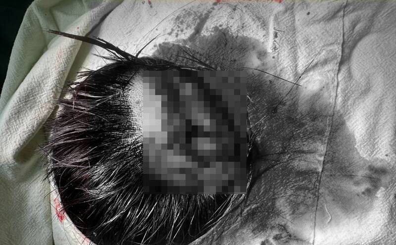 Toyz遭超哥爆打頭部撕裂傷濺血,在醫院縫了10多針。(林姓律師提供)