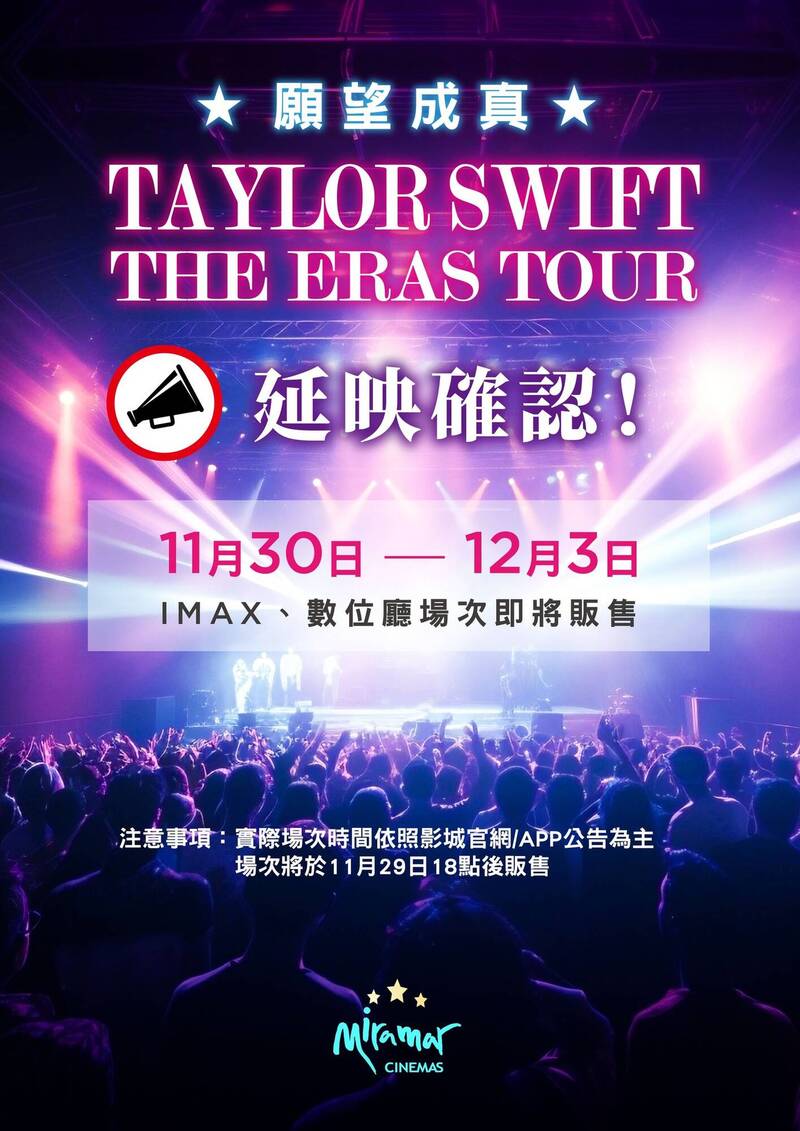 美麗華影城宣布,原先只有在台灣上映11月3、4、5、9、10、11、12、16、17、18、19、23、24、25、26十五天的《TAYLOR SWIFT: THE ERAS TOUR》電影,將會特別延長4天,於11月30日、12月1、2、3日於美麗華影城獨家延長上映,眾多歌迷聽到消息,準備再至影廳體驗女神魅力。