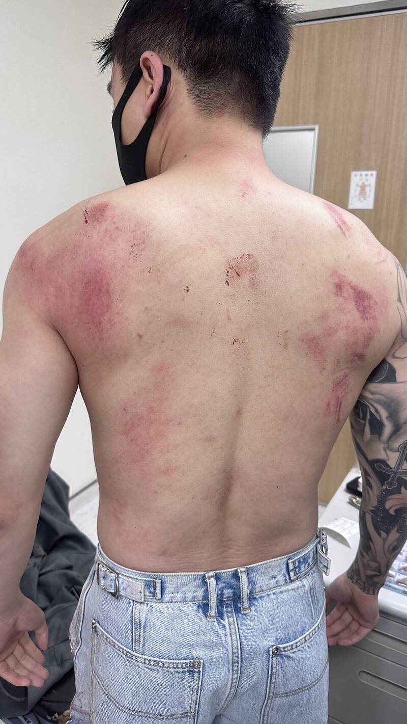 Toyz遭超哥爆打送醫治療,背部有多處擦挫傷。(林姓律師提供)