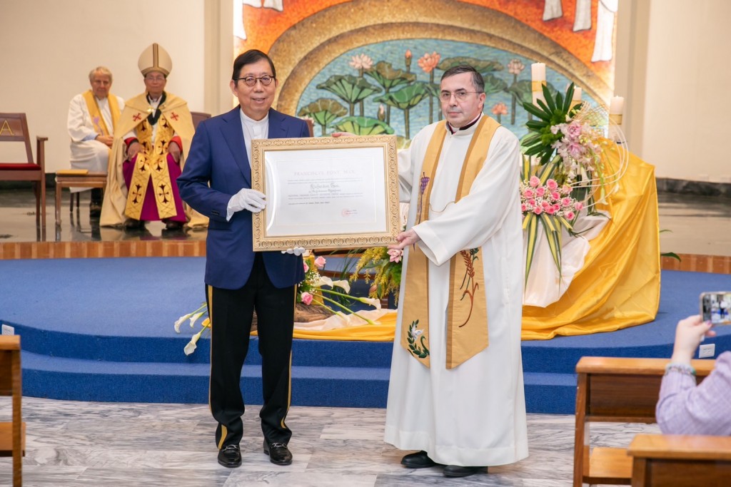 冊封典禮由鍾安住總主教代表教宗頒授爵位,在以拉丁文及中文宣讀教宗詔書後,將表徵屬神甲冑的禮服禮冠、及象徵真理的寶劍授予蔡明興董事長,並頒授勳章及詔書,肯定受勳者蔡明興董事長從此刻起有更多服務的責任。